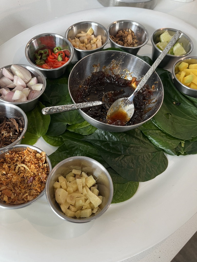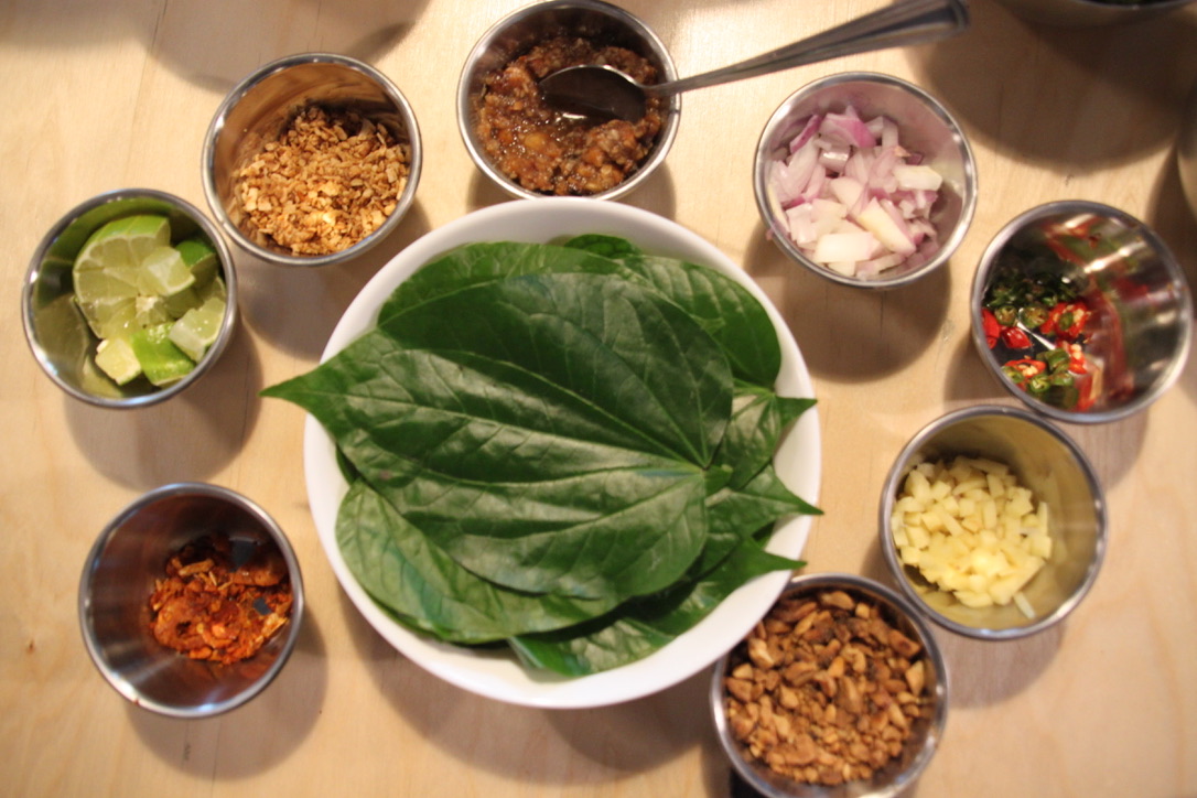 Le principe est simple : chaque convive compose sa propre bouchée à partir d’une feuille de bétel (ou d’une alternative), garnie de plusieurs ingrédients, puis nappée d’une sauce sucrée-salée.