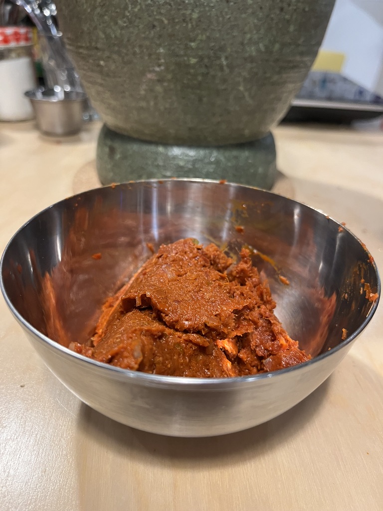 - Pour les piments réhydratés, écrasez-les jusqu’à obtenir une pâte lisse et homogène.